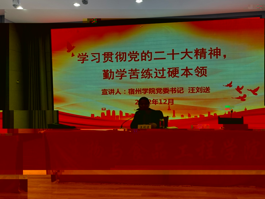 為深入學習宣傳貫徹黨的二十大精神,領會中國式現代化的創新理論思想,加深師生黨員對中國式現代化的認識,12月7日下午,黨委書記汪劉送以“學習貫徹黨的二十大精神,勤學苦練過硬本領”為主題,為生工學院師生宣講黨的二十大精神。生工學院科級以上幹部、輔導員、教師代表及22級學生代表參加宣講會。宣講會由生工學院黨委書記趙亮主持。